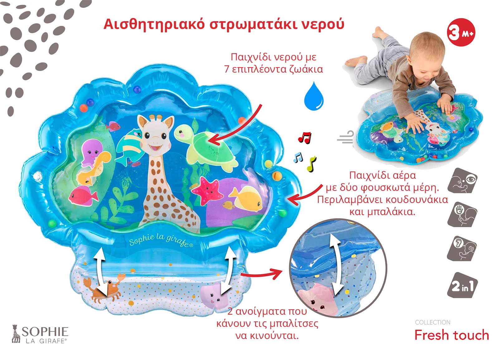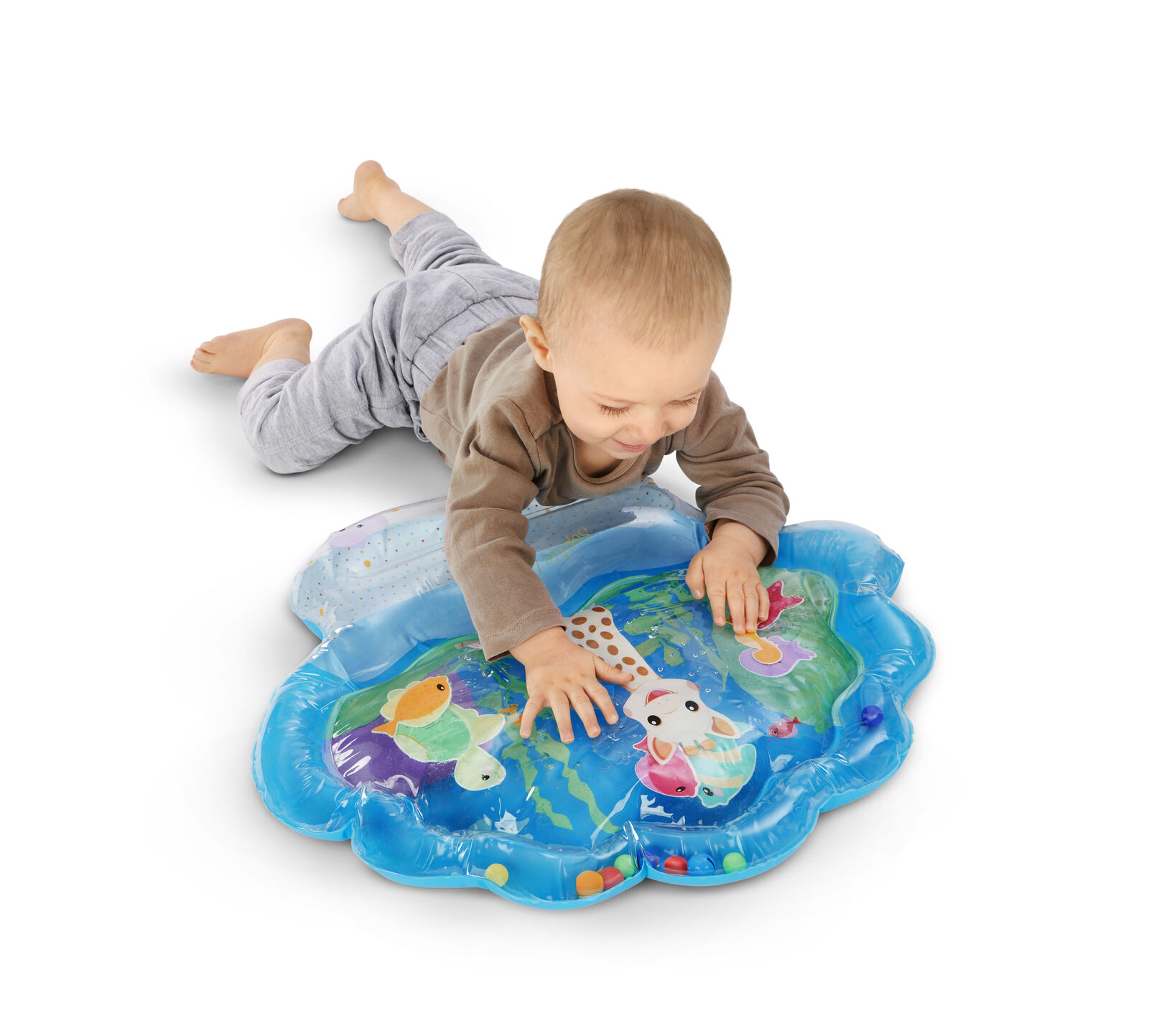 Όταν το μωρό πιέζει το κέντρο του στρώματος, το νερό κινείται και τα 7 επιπλέοντα ζωάκια μετακινούνται με τα “ρεύματα”. Έτσι το παιδί ανακαλύπτει αιτία-αποτέλεσμα και πειραματίζεται με την αφή.