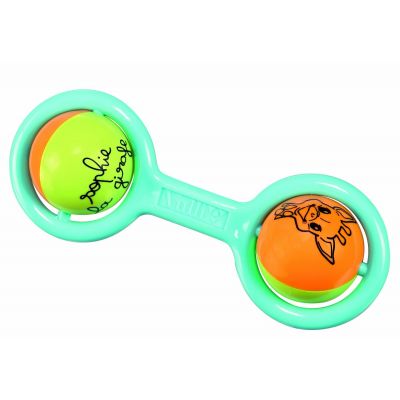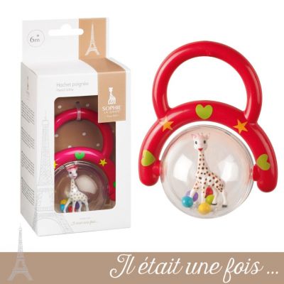 Μία ελαφριά διάφανη κουδουνίστρα σε μορφή μαράκας. Μικρές και μεσαίες μπαλίτσες ανεβοκατεβαίνουν γύρω από τη Σόφι καθώς το μωρό σας παίζει και κουνάει την αγαπημένη του κουδουνίστρα. Το μωρό σας παρακαλουθεί τη διαρκή κίνηση των χρωμάτων, καθώς περιστρέφει και κουνάει τη κουδουνίστρα του. Η άλλη πλευρά είναι μια μαλακή πάνινη crunchy μπαλίτσα, που όσο πατιέται τόσο ακούγεται σα να τσαλακώνεται και φυσικά το μωρό σας δε θα σταματήσει να πιπιλάει και να ανταποκρίνεται στους ήχους του παιχνιδιού του.